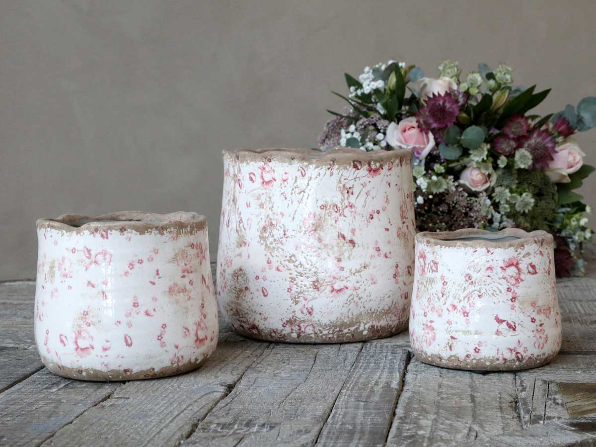 Ein wunderschöner Übertopf mit zartem Blumenmotiv aus der Reihe Cannes von Chic Antique. Farbe: Antikcreme Maße: H12/T13 cm Material: Keramik Versandbereit innerhalb von 24 Stunden.