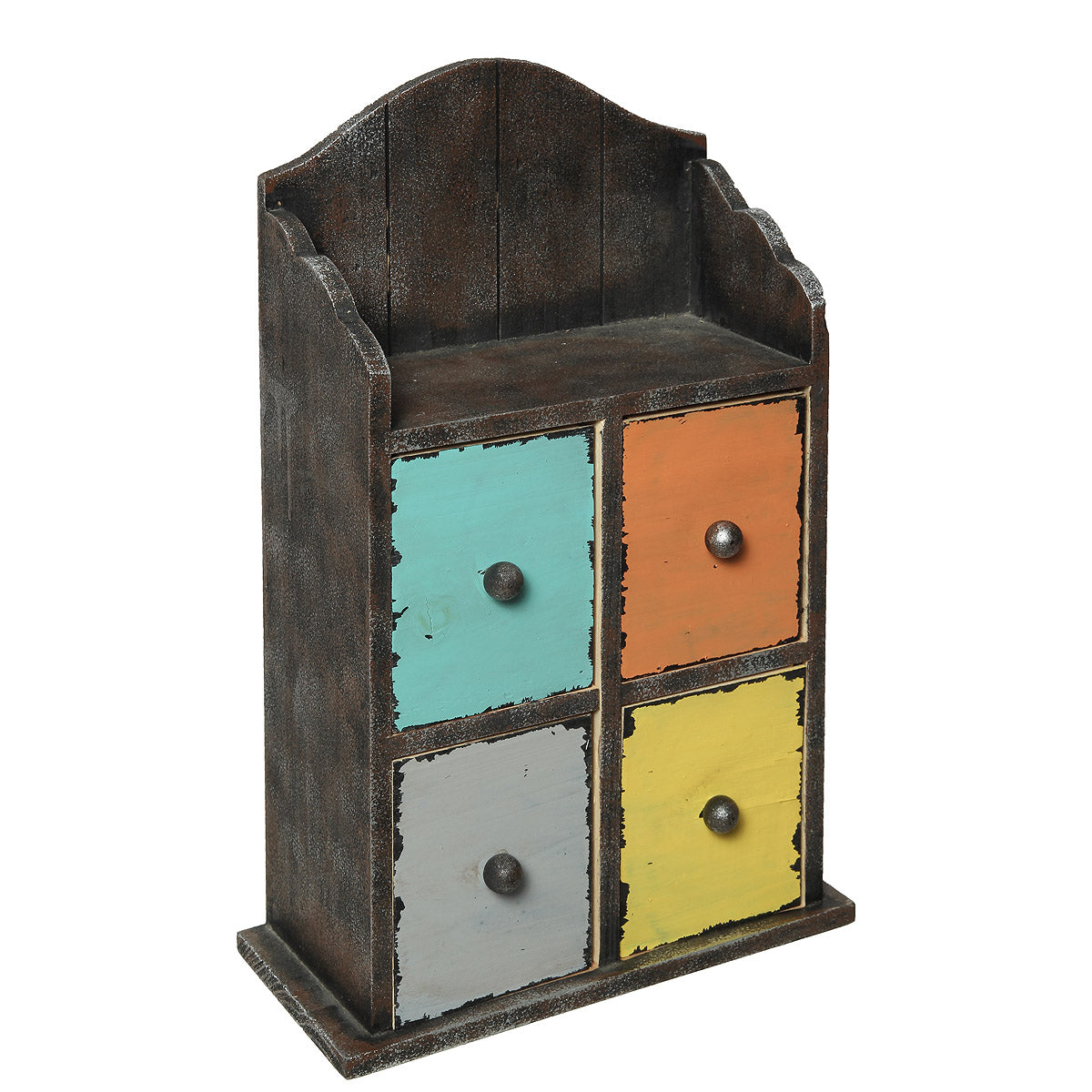 Kleines Regal mit 4 Schubladen. Der Korpus ist in Metalloptik gehalten, die Schubladen sind verschiedenfarbig im Vintage-Look lackiert.