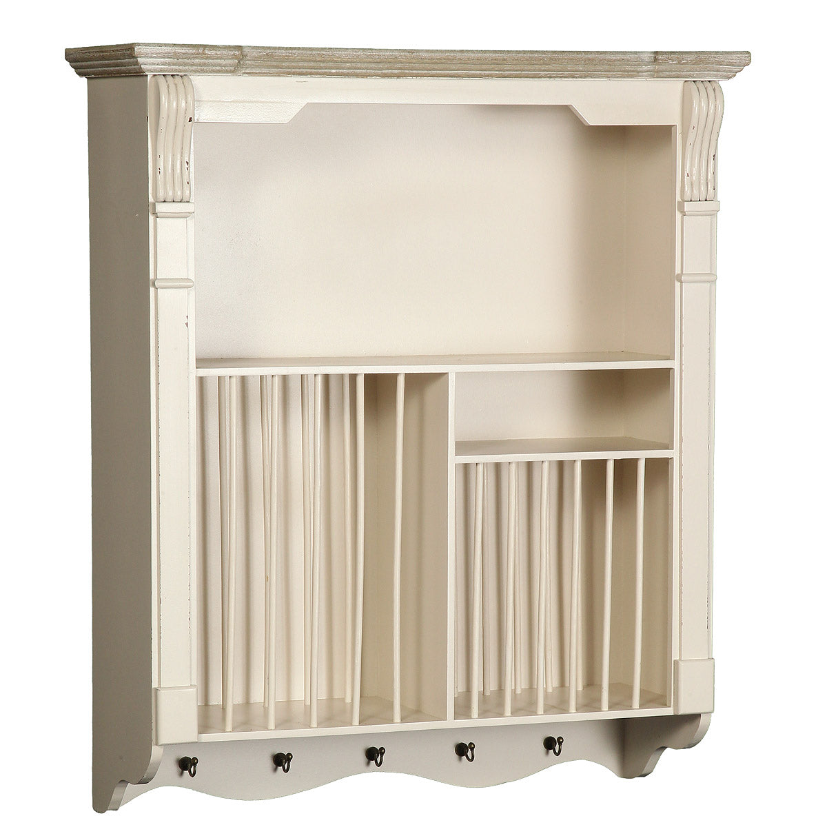 Schönes und praktisches Wandregal mit Tellerablagen und Haken für zB Tassen. Die eingearbeiteten Gebrauchsspuren sorgen für den antiken Charakter. Die Möbel werden in Handarbeit gefertigt und lackiert, dadurch kann es zu leichten Farbunterschieden im Vergleich mit anderen Möbeln der Country-Reihe kommen.