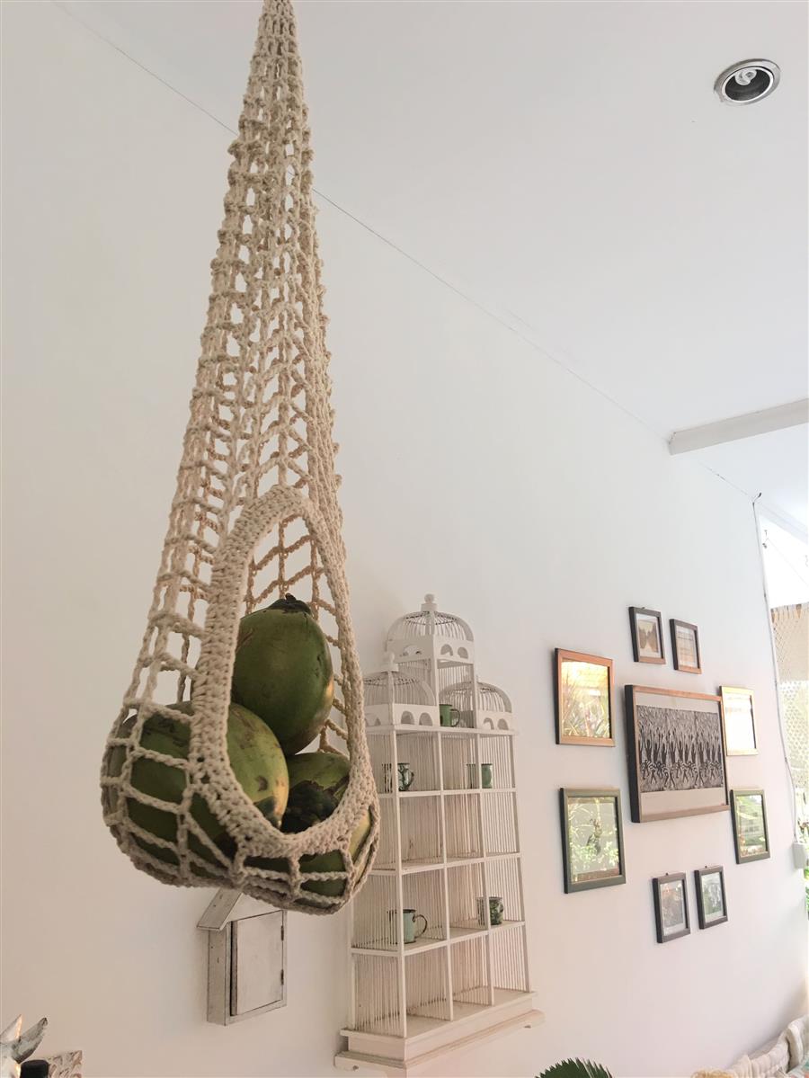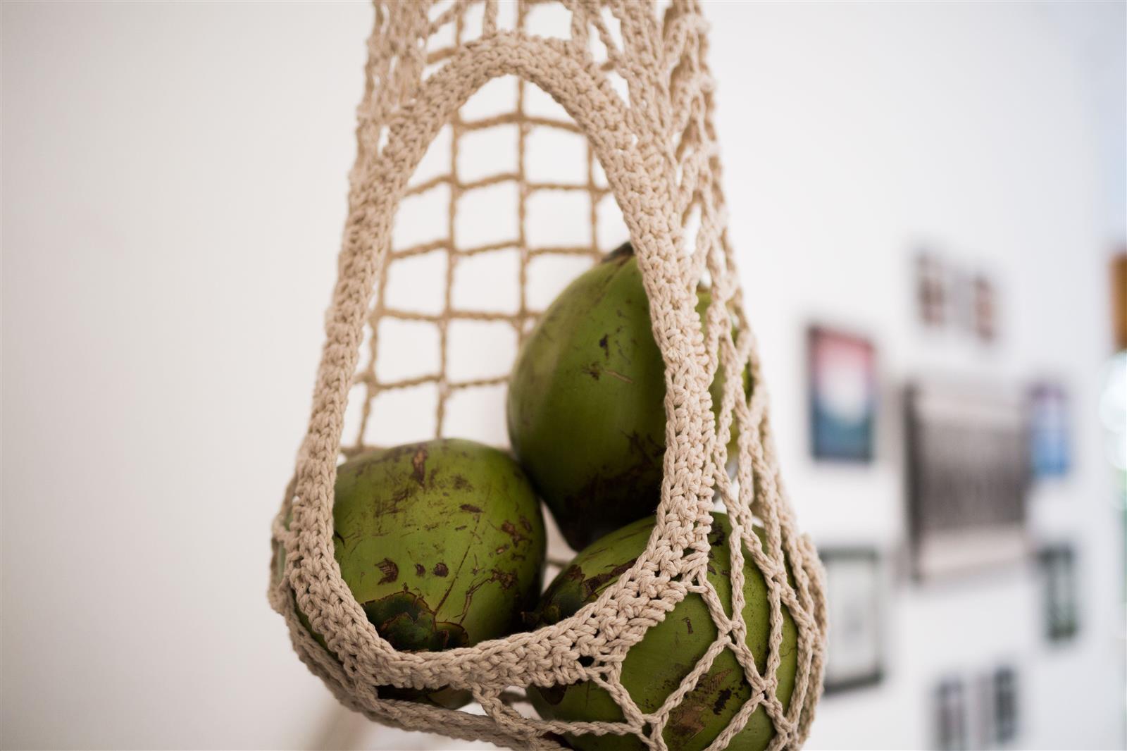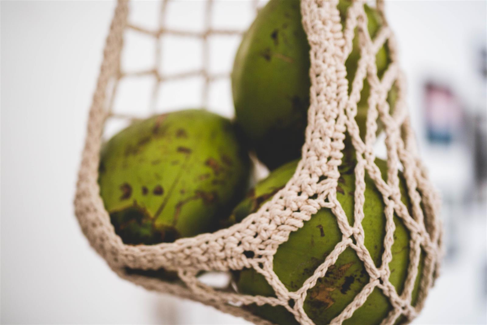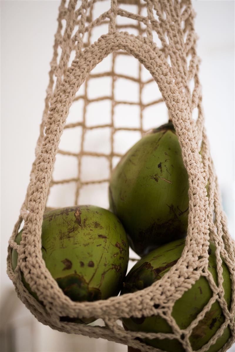 Der Kandui ist eine praktische Hängeobsttasche aus Bio-Baumwolle, die Platz auf der Küchentheke schafft und gleichzeitig dafür sorgt, dass Ihr Obst länger frisch bleibt. Dieser Makramee-Obstkorb misst 1,2 m in der Länge.