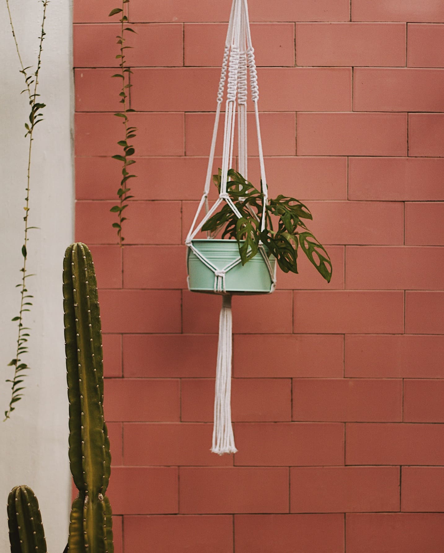 Der Watu Makramee-Pflanzenhänger ist aus 100 % natürlicher Baumwollschnur handgefertigt und mit Pflanzenfarben gefärbt. Dieser Makramee-Pflanzenaufhänger für drinnen und draußen ist 110 cm lang.