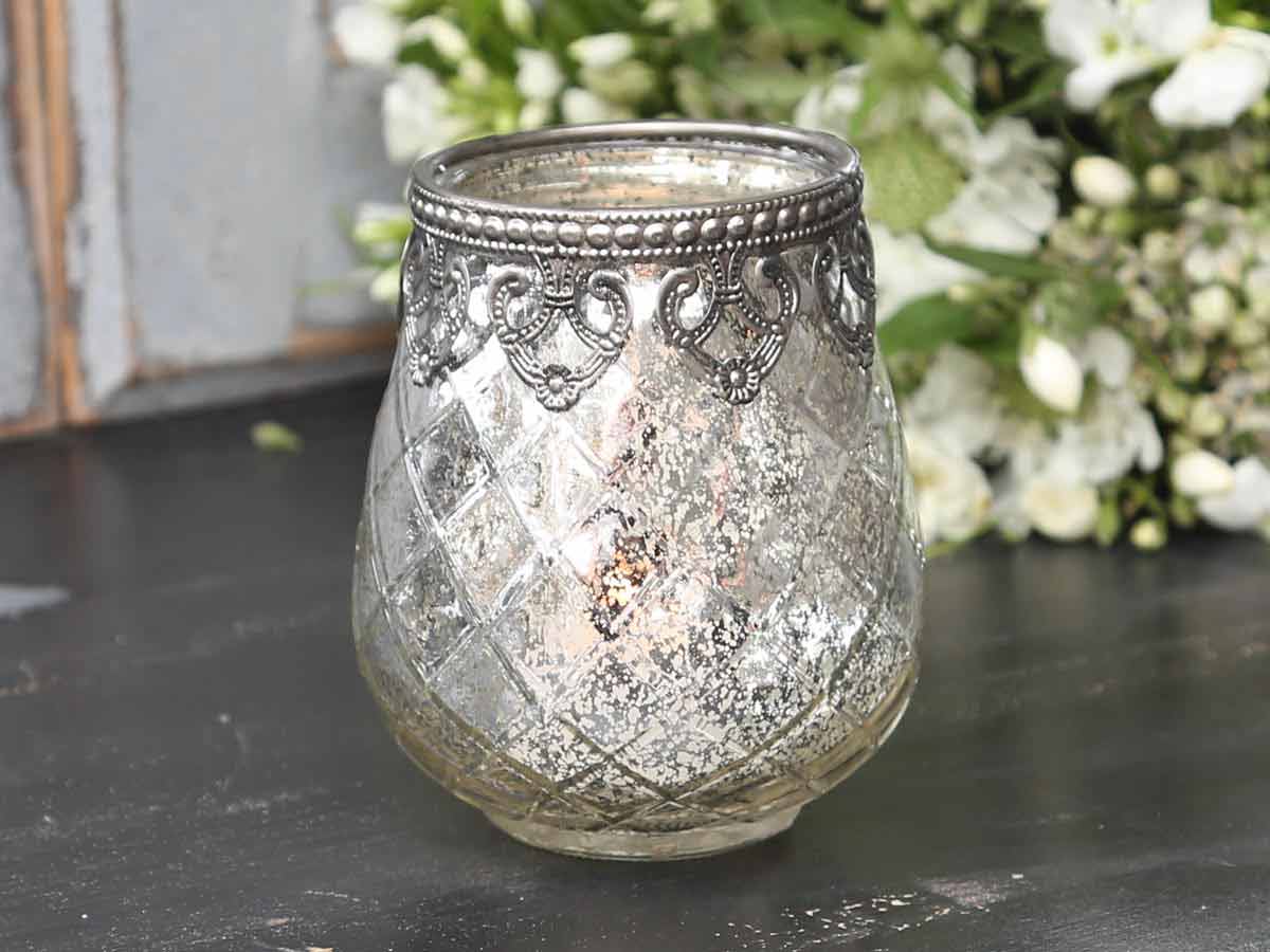 Wunderschöner eleganter Teelichthalter mit Silberdekor von Chic Antique. Farbe: Antiksilber Maße: H10,5/T9 cm Material: Glas, Eisen Versandbereit innerhalb von 24 Stunden.