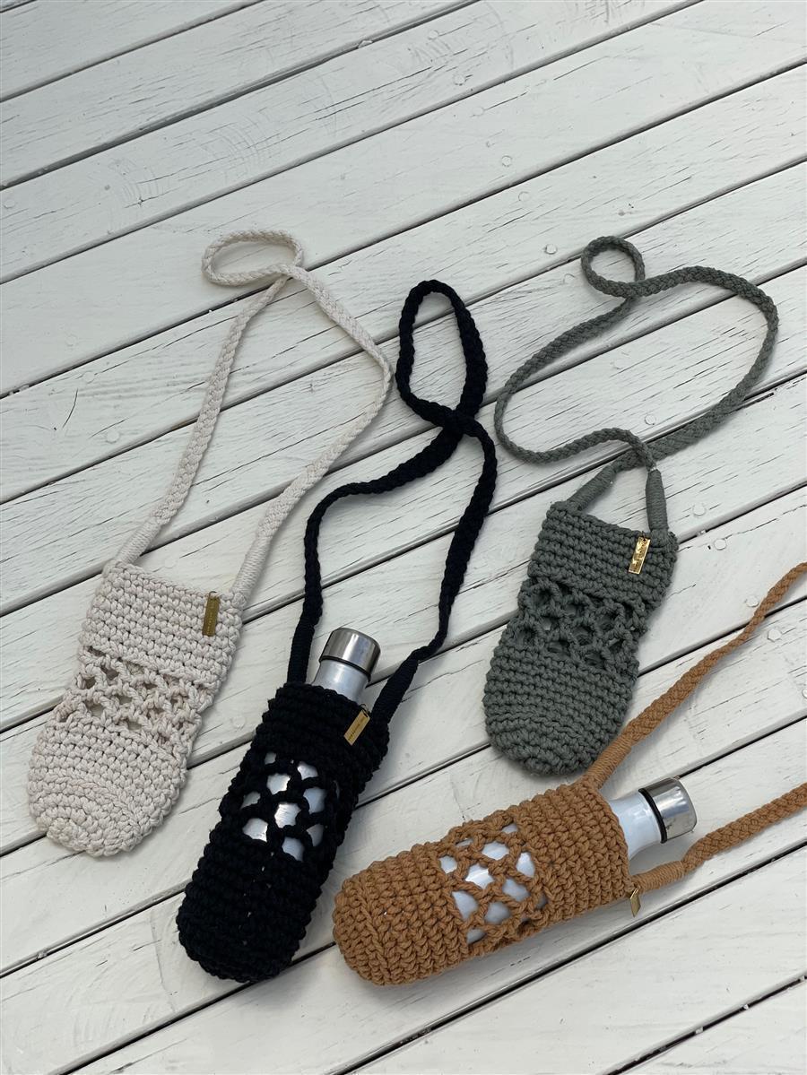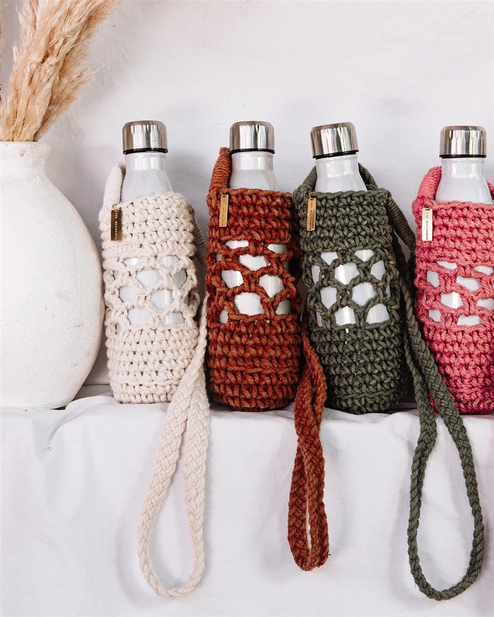 Die Makramee-Wasserflaschentasche von Jambu ist eine stilvolle und praktische Lösung, um die Hände frei für Ihre Wasserflasche zu haben. Perfekt für den Transport Ihrer Wasserflasche bei Spaziergängen, Wanderungen, Ausflügen zum Strand und mehr. Der Flaschenrucksack ist aus Bio-Baumwollgarn gefertigt und hat eine Länge von 85 cm.