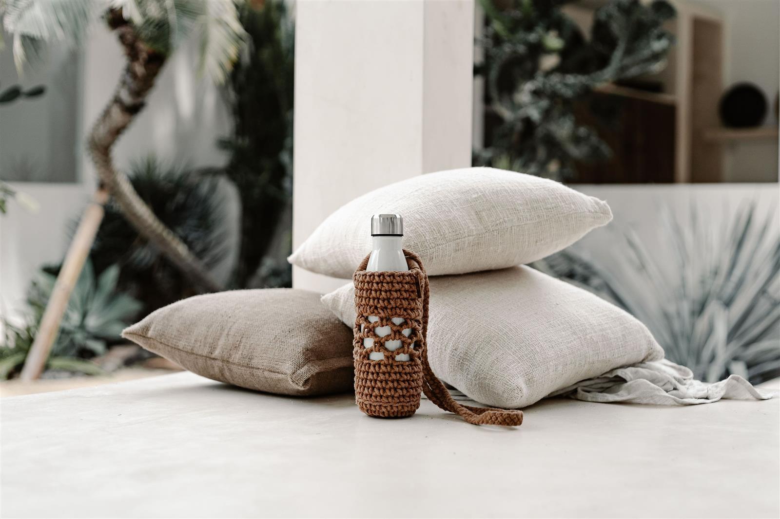 Die Makramee-Wasserflaschentasche von Jambu ist eine stilvolle und praktische Lösung, um die Hände frei für Ihre Wasserflasche zu haben. Perfekt für den Transport Ihrer Wasserflasche bei Spaziergängen, Wanderungen, Ausflügen zum Strand und mehr. Der Flaschenrucksack ist aus Bio-Baumwollgarn gefertigt und hat eine Länge von 85 cm.