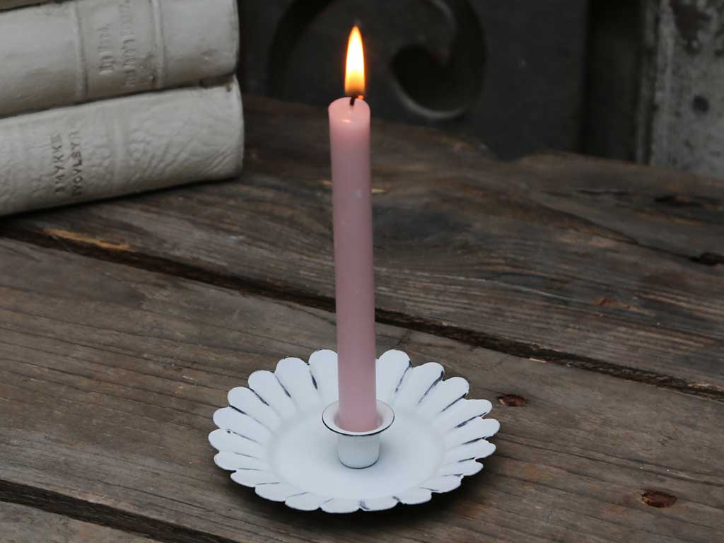 Toller dezenter Kammerleuchter in Form einer Margerite von Chic Antique. Farbe: antique weiß Maße: D10 cm Material: Eisen Passende Stabkerzen D1,2cm Versandbereit innerhalb von 24 Stunden.