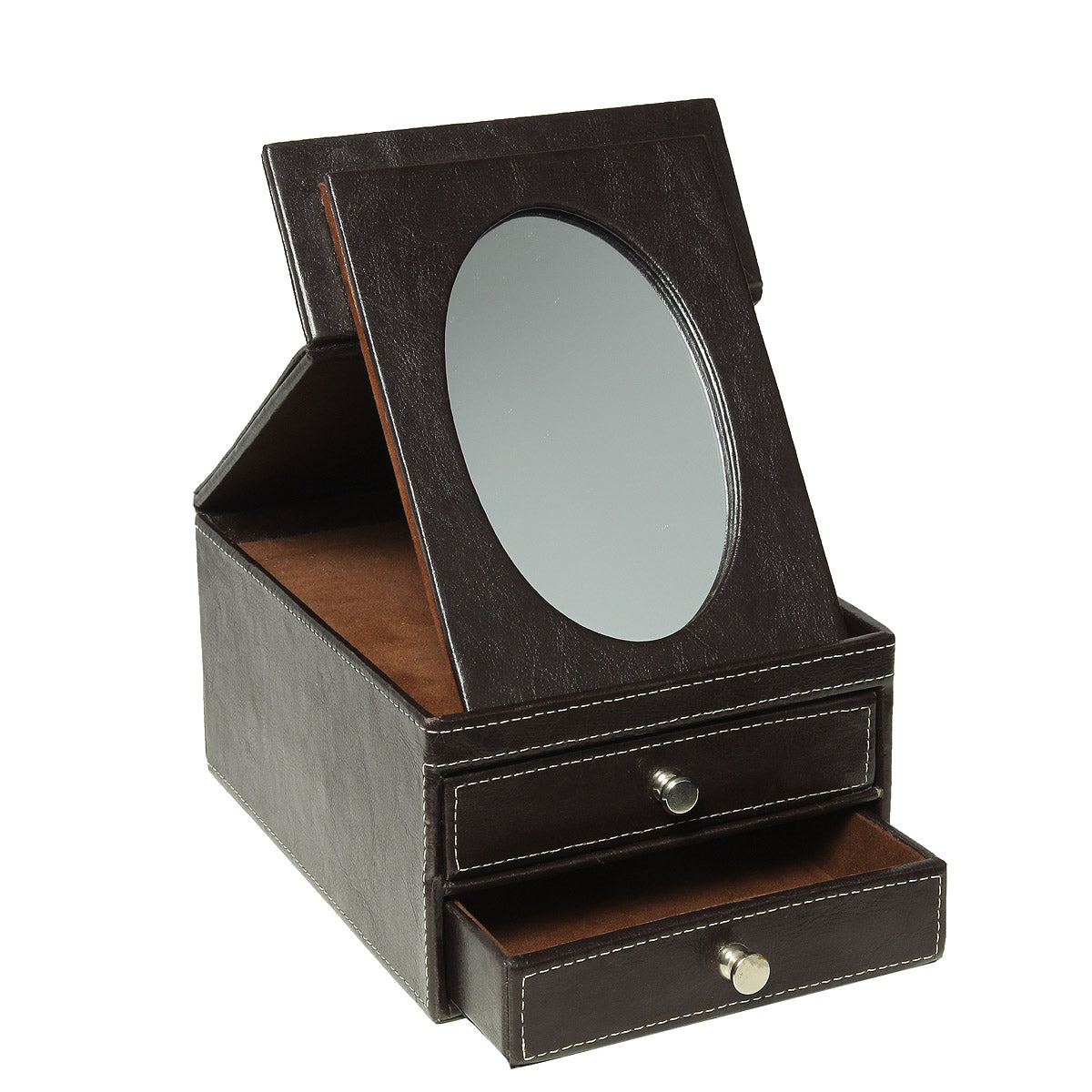 Edles Schmuckkästchen mit zwei Schubladen und einem aufklappbaren Spiegel . Der Korpus ist mit braunem Kunstleder bezogen und mit weißen Ziernähten versehen . Das Innere ist mit Velours ausgekleidet .