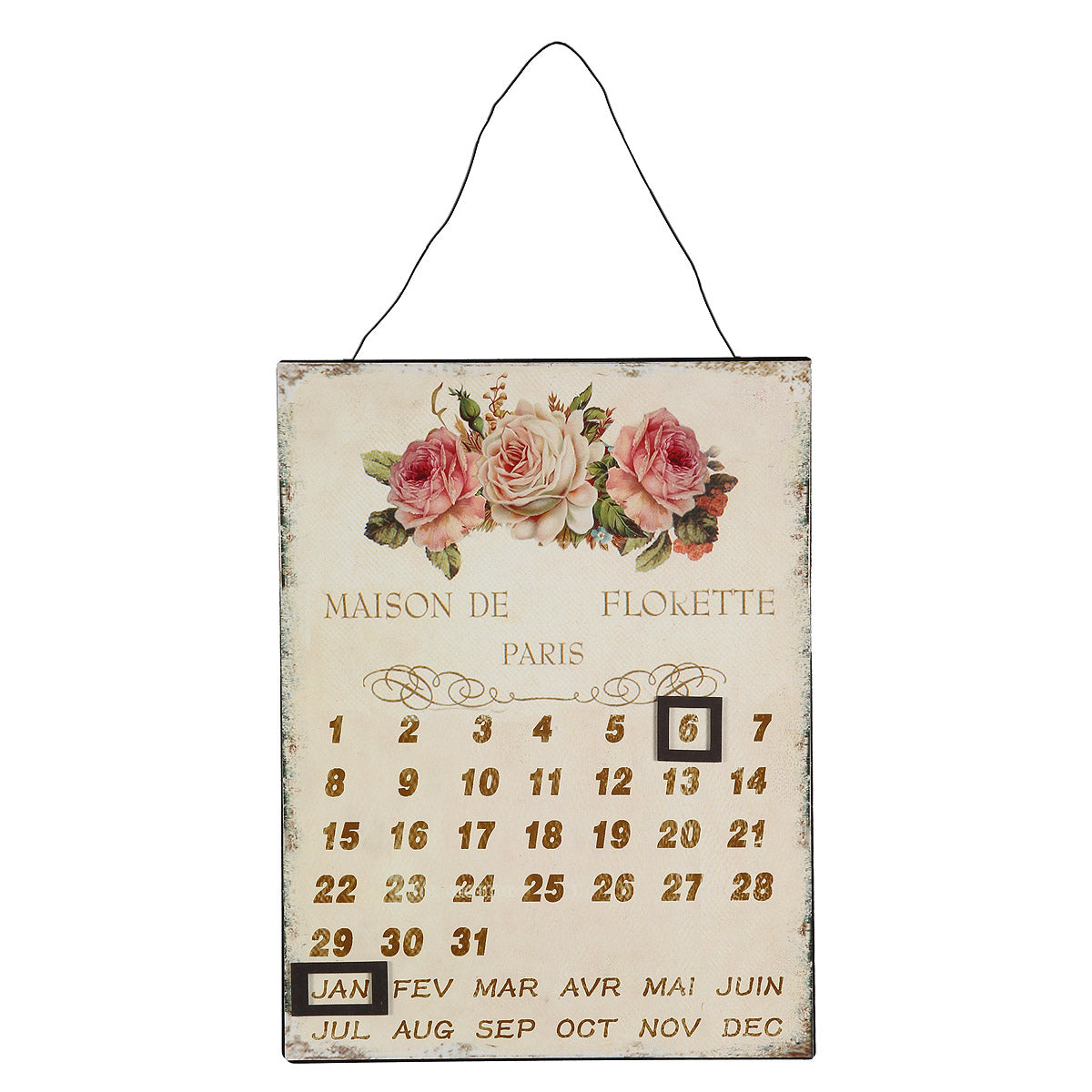 Ein Metallkalender im Landhausstil mit Rosenmotiven. Durch magnetische Rechtecke kann der Monat und das Datum eingestellt werden.