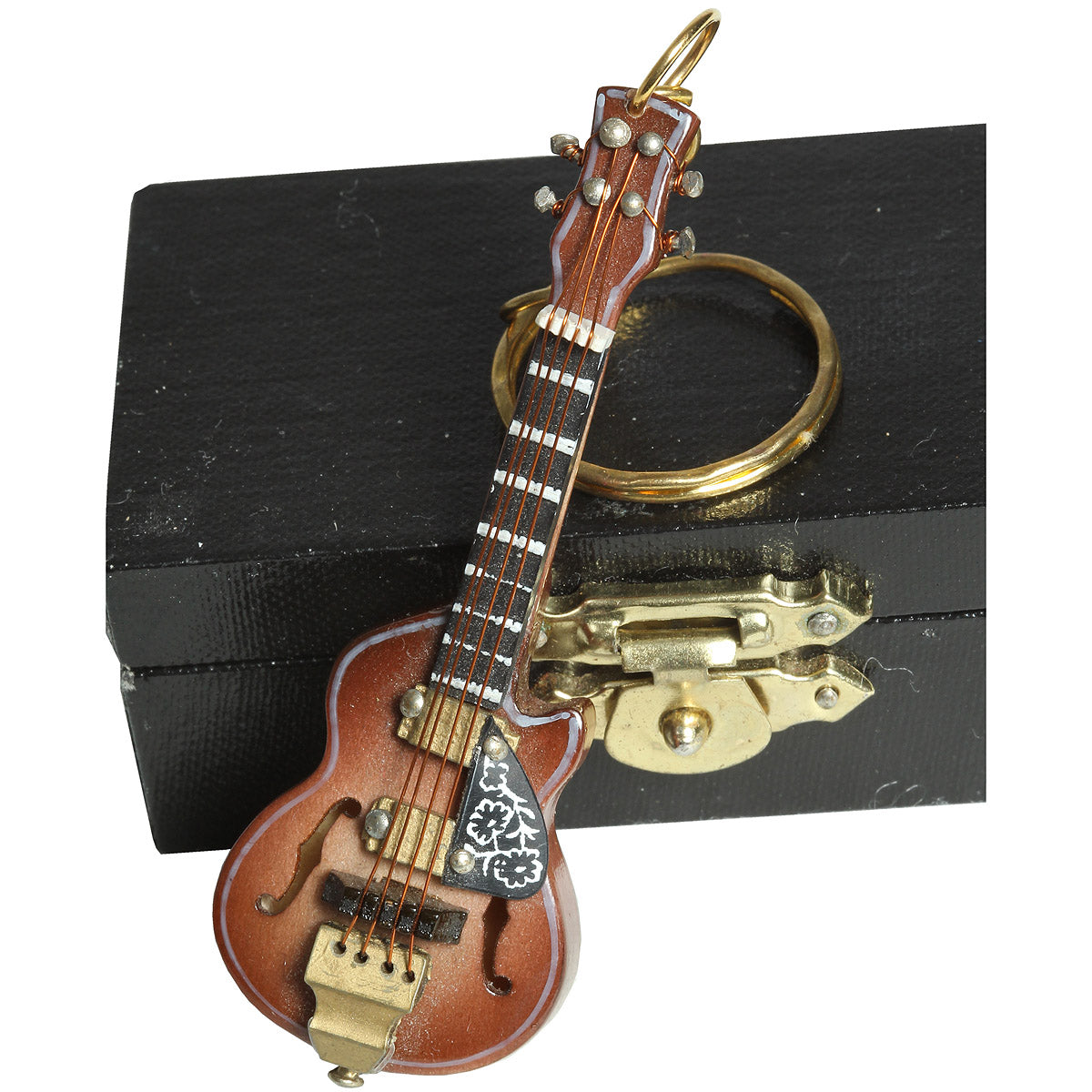 Dieser Schlüsselring ist aus 24 Karat vergoldetem Metall gefertigt und wird mit der Gitarre aus Holz zu einem luxuriösen Geschenk. Verpackt in einer edlen Präsentationsbox aus Holz, die mit rotem Samt ausgeschlagen ist, ist es das perfekte Geschenk.