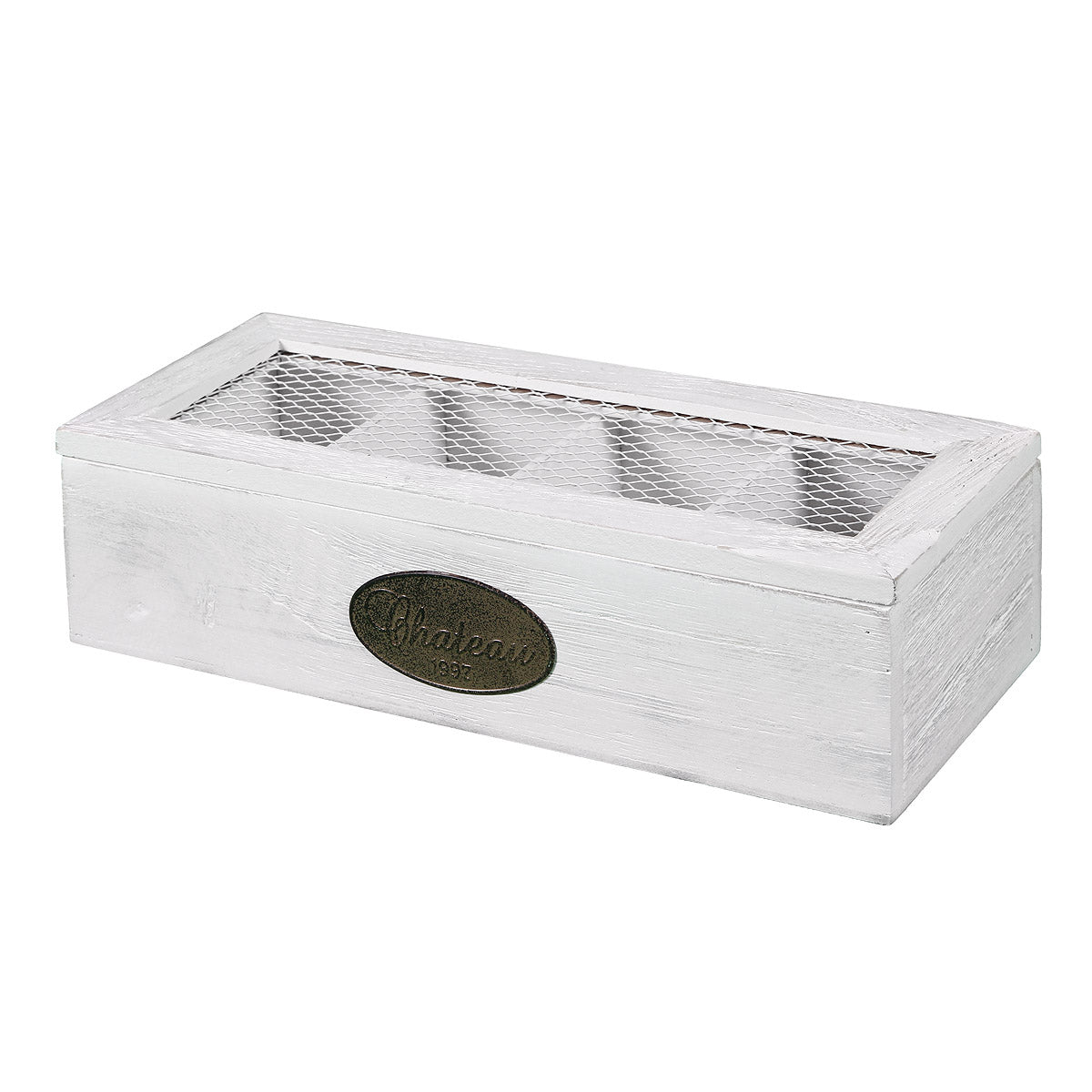 Es verfügt über 4 Faecher (à 6 x 9cm),die perfekt für die Aufbewahrung von Tee oder auch anderen Kleinteilen (z. B. kleinere Backzutaten) sind. Der Deckel ist aus einem antiqueweissfarbenem Drahtgeflecht und lässt sich mittels zwei Metallscharnieren öffnen und schliessen.